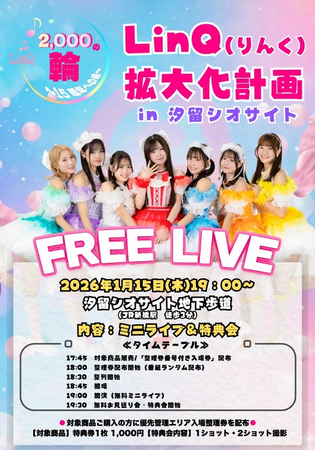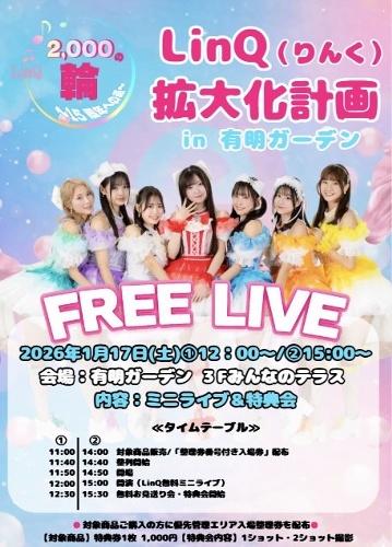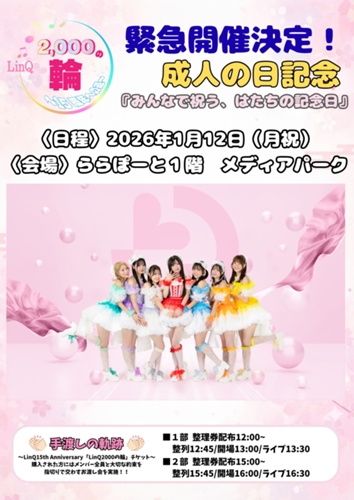 LinQ15th Anniversary「LinQ2000の輪」「手渡しの奇跡。手売りチケット」(自由席・1階)が会場で販売されます。恒例となっている「お約束会(※メンバーとの指切り)」も実施されますので、15周年の特別な時間をともに過ごしましょう。