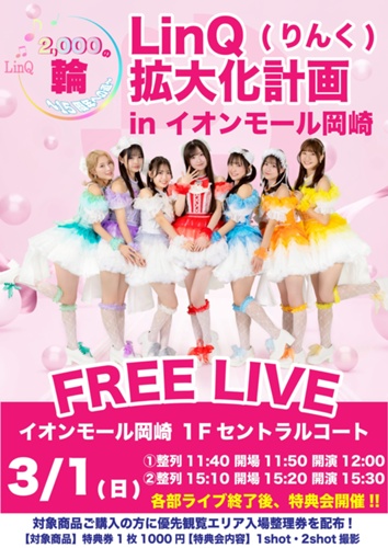 【緊急開催決定!!】 3月1日(日)愛知県・イオンモール岡崎にて「LinQ 2000の輪 拡大化計画 2026 in イオンモール岡崎」が急遽開催されることになりました。4月に開催されるLinQ15周年ライブを目前に東海地区の皆さんに、 LinQのライブをお届けできればと思います。 福岡から全国へ、そして2,...