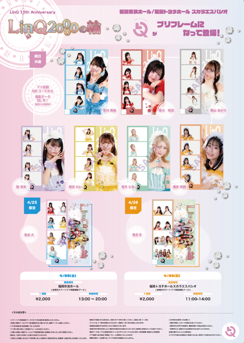 プリ撮影 営業時間・場所 4月25日(土) LinQ15th Anniversary「LinQ2000の輪」 13:00~開演まで / 終演後~20:00 まで 福岡市民ホール内|スマートプリ特設撮影ブース 4月26日(日) 15周年記念大特典会&ミニライブ 11:00~14:00 福岡トヨタホールス...