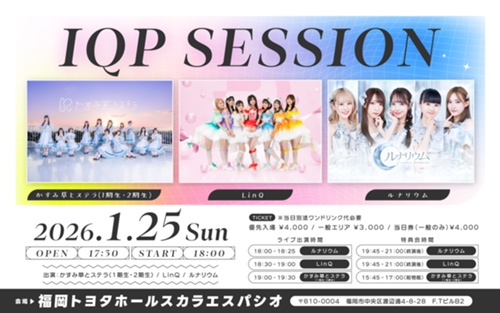 【タイトル】IQP SESSION【日程】2026年1月25日(日)【時間】開場17:30 開演18:00【会場】福岡トヨタホールスカラエスパシオ 〒810-0004 福岡県福岡市中央区渡辺通4丁目8−28 F.Tビル 地下2階【出演】かすみ草とステラ、LinQ、ルナリウム 【チケット】<券種>オ...