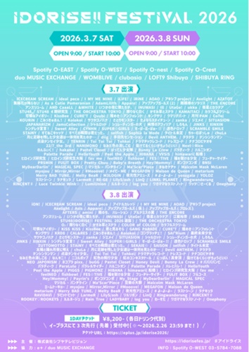 タイトルIDORISE!! FESTIVAL 2026 開催日時2026年3月7日(土)、8日(日) 開場/開演:09:00/10:00 ※リストバンド交換 / 08:00~【LinQ出演時間】 3月7日(土) ライブ/14:55-15:25【Spotify O-WEST】3月8日(日) ライブ/11:35...