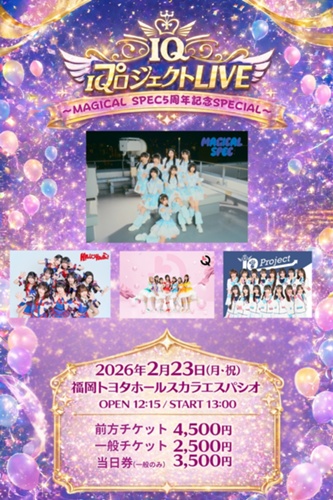 公演タイトルIQプロジェクトライブ ~MAGICAL SPEC5周年記念SPECIAL~会場福岡トヨタホール スカラエスパシオ開催日時2026年2月23日(月祝) <開場/開演>12:15/13:00 <ライブ時間>13:00-15:20 <特典会>15:30-17:00 ※予定時間は前後する可能がございます...