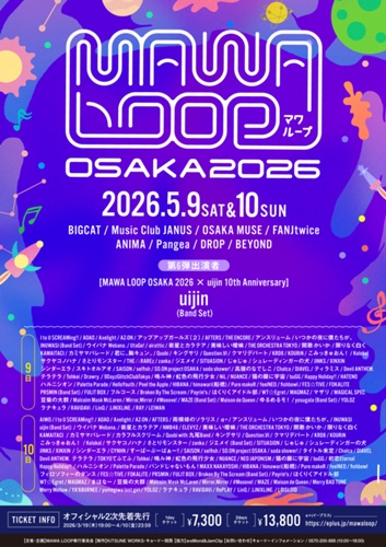 タイトル MAWA LOOP OSAKA 2026開催日時 2026年5月9日(土)、10日(日)会場 BIGCAT / Music Club JANUS / OSAKA MUSE / FANJtwice / LiveHouseANIMA / DROP / BEYOND / Pangeaチケット情報 ◆1da...
